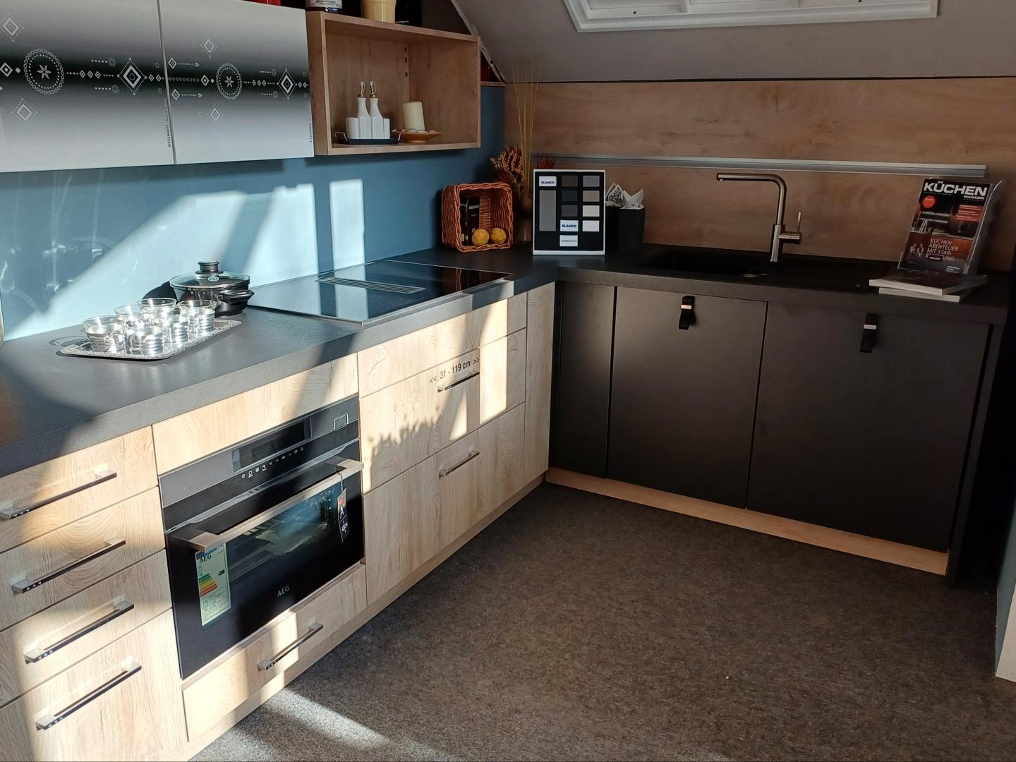Musterküche Koje 8 "Mammut Eiche natur , Arbeitsplatte graphitschwarz mit Karusell-Eckunterschrank